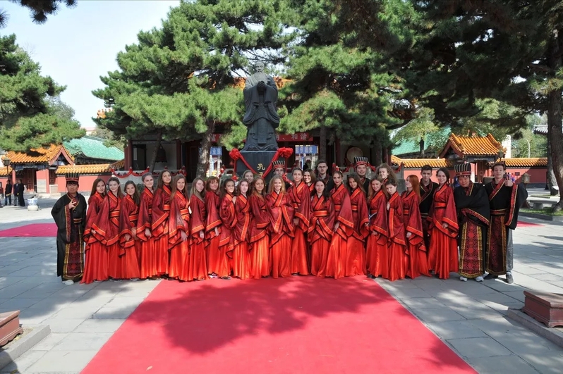 我校32名孔子学院奖学金生参加了大典仪式。上午9时20分,哈尔滨市文庙内弦歌阵阵,雅乐齐鸣,在庄严肃穆,中正平和的礼乐声中祭孔大典正式拉开帷幕。我校留学生身着汉服,表情严肃,整齐地列队于祭孔队伍中。击鼓、撞钟之后,文庙中央的大成门徐徐开启,我校留学生作为国际学生代表,穿过大成门,走上大成殿,向先师孔子敬献花篮、鞠躬致敬。活动现场,丝竹雅乐悠扬回转,经典诵读激荡人心。浓厚的中国传统文化氛围、深邃的儒学意境以及人们对圣贤的敬仰感染着每一位学生。对于留学生们,这是一次饱尝中国传统文化的盛宴,传统服饰、传统乐器、传统舞蹈,以及千年传承的礼仪规范无不强烈地吸引着他们。
